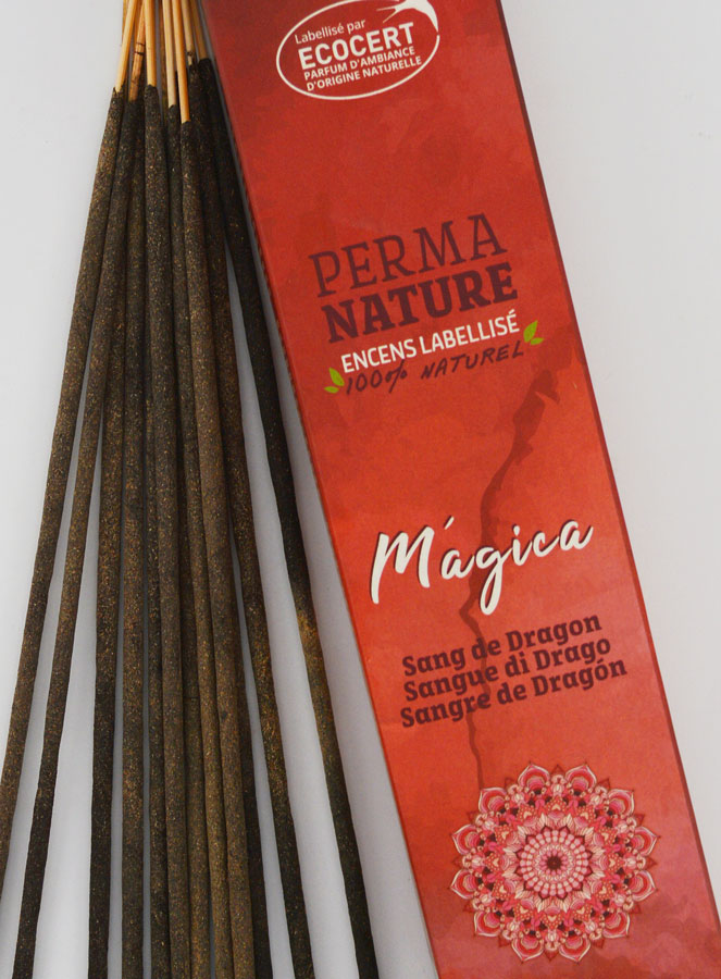 Incienso Sangre de Dragón Premium Etiqueta Ecocert, estas barritas de incienso de primera calidad están elaboradas con elementos 100% naturales, desde la composición del producto hasta su embalaje. Etiqueta Ecocert (certificación europea de producto eco-responsable). Caja de 12 a 15 barritas, peso 15g.