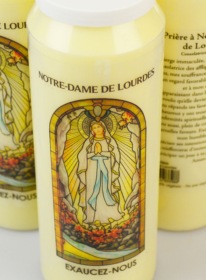 Juego de 3 Velas de Novena a Nuestra Señora de Lourdes con Oración en el reverso - 17,5cm. Esta vela de novena tiene imagen y oración de Nuestra Señora de Lourdes. Una novena es una vela que permanece encendida durante nueve días consecutivos, se reza durante estos nueve días y permite encontrar la serenidad, la paz y dar gracias a Dios por intercesión de los Santos. Rezar a la Santísima Virgen de Lourdes, invocada como consoladora de los afligidos, gracias a la oración en el dorso del cirio. Enciende esta vela en tu rincón de oración y crea un lugar sereno y de oración con esta novena. Fiesta: 11 de febrero. Vela de novena 100% aceite vegetal. Duración 9-10 días.