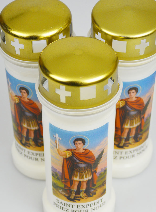 Lote de 3 Velas de Cementerio - San Expedito, este lote de 3 velas de exterior luce 60 horas.