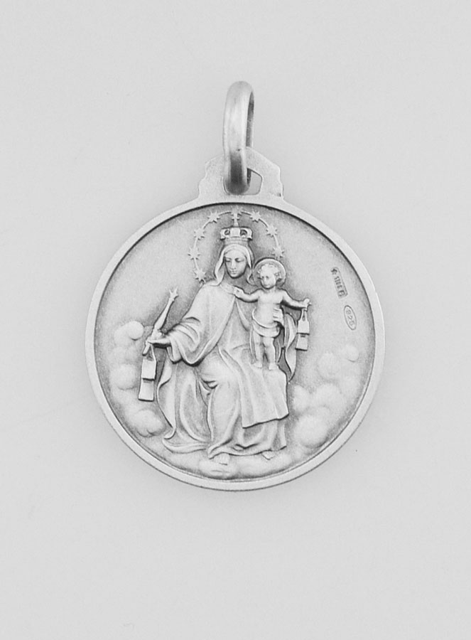 Medalla del Escapulario de Plata de Ley - 18 mm, esta medalla del Escapulario es de plata de ley 925/1000. La medalla está gravada por ambos lados, Punzón de plata, Diámetro de la medalla 18 mm.