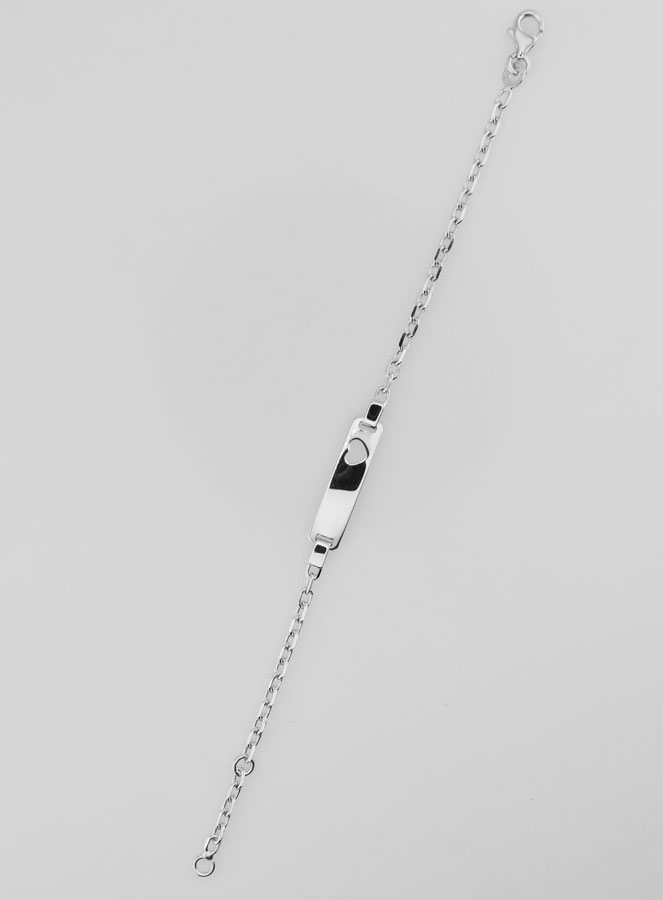 Pulsera de bautismo en Plata Placa Corazón - malla 2,6mm - esta bonita pulsera en plata maciza 925/1000 rodiada tiene una placa de identidad para grabar o no con motivo de corazón, cadena plana de malla forzada de 2,6mm de ancho. Es ajustable en longitud a 13,5cm o 15,5cm. Para solicitar el servicio de grabado como servicio adicional, haga clic en el botón correspondiente.