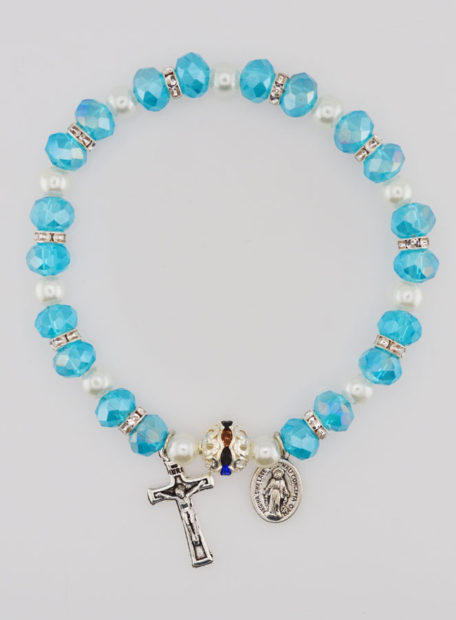 Pulsera Religiosa Virgen Milagrosa – Azul Cielo, esta bonita pulsera está compuesta por cuentas translúcidas, cuentas de perla blanca y cuentas planas con pedrería de metal plateado, montadas en elástico de 16-18cm. También está adornada con la cruz de Cristo y la Medalla Milagrosa de la Calle du Bac.