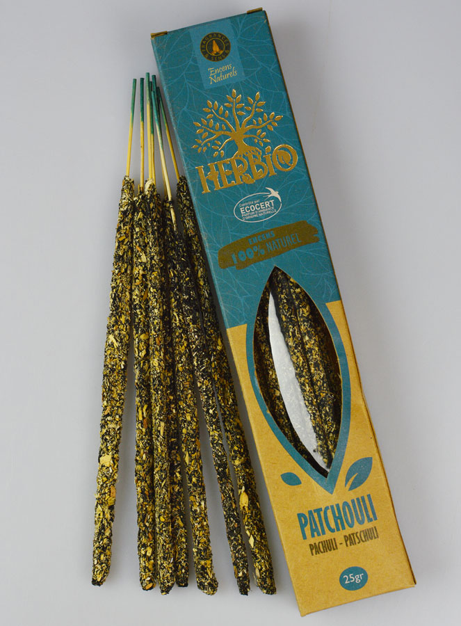 Varitas de incienso HERBIO Eco-Certificado - Pachulí 25g, caja de 7 varitas de incienso elaboradas a partir de una mezcla 100% natural de hierbas aromáticas, resinas naturales y aceites esenciales, en envases totalmente reciclables y biodegradables. Cada barra arde aproximadamente 75 minutos. Este incienso ha recibido certificación 100% natural. El sello Ecocert garantiza: El uso de recursos renovables e ingredientes de origen natural u orgánico, la implementación de procesos de producción y transformación respetuosos con el medio ambiente, la ausencia de ingredientes petroquímicos, total transparencia gracias a una lista completa de ingredientes en el etiquetado, así como Trazabilidad ininterrumpida en toda la cadena de producción.
