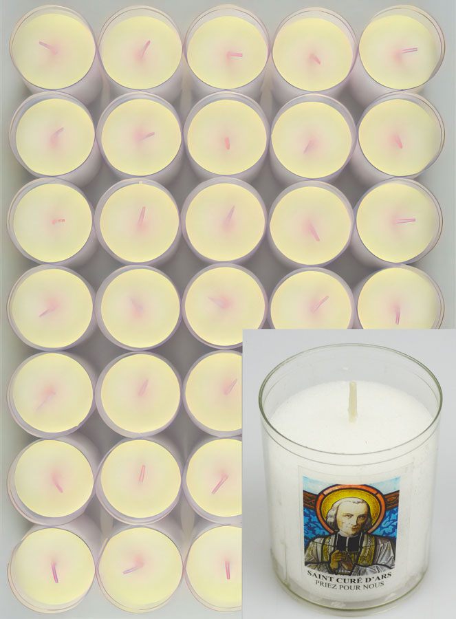 48 Velones Santo Cura de Ars, cada velón de iglesia dura 20h como mínimo. A la imagen del Santo Cura de Ars. Fabricación Francesa lote de 48.