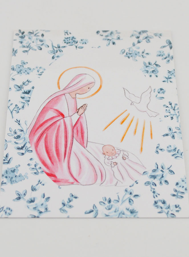 Estampa de Bautizo - Virgen María y Paloma del Espíritu Santo - Rosas Azules, esta estampa está hecha por Elisabeth (dibujante cristiana) exclusivamente para nuestra tienda. 10 X 7 cm.