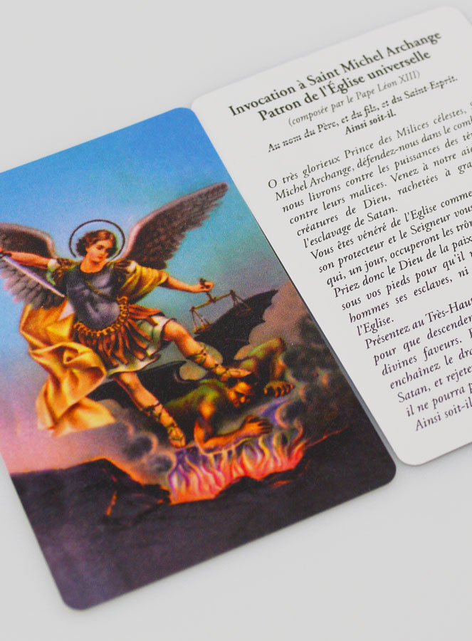 Bonita estampa de oración a San Miguel Arcángel, para rezar en todos lados ¡para meter en todos los bolsillos! Oración a San Miguel Arcángel como protector especial: O grand Prince du ciel, gardien très fidèle de l'Église , saint Michel Archange, moi , quoique très indigne de paraître devant vous, confiant néanmoins dans votre spéciale bonté, touché de l'excellence de vos admirables prières et de la multitude de vos bienfaits, je me présente à vous accompagné de mon Ange gardien et en présence de tous les Anges du ciel que je prends à témoin de ma dévotion envers vous. Je vous choisis aujourd'hui pour mon protecteur et mon avocat particulier, et je me propose fermement de vous honorer toujours, et de vous faire honorer de tout mon pouvoir. Assistez-moi pendant toute ma vie, afin que jamais je n'offense Dieu gravement ni en oeuvres ni en paroles, ni en pensées. Défendez-moi contre toutes les tentations du démon, spécialement pour la foi et la pureté, et à l'heure de ma mort, donnez la paix à mon âme et introduisez-la dans l'éternelle patrie. Ainsi soit-il.