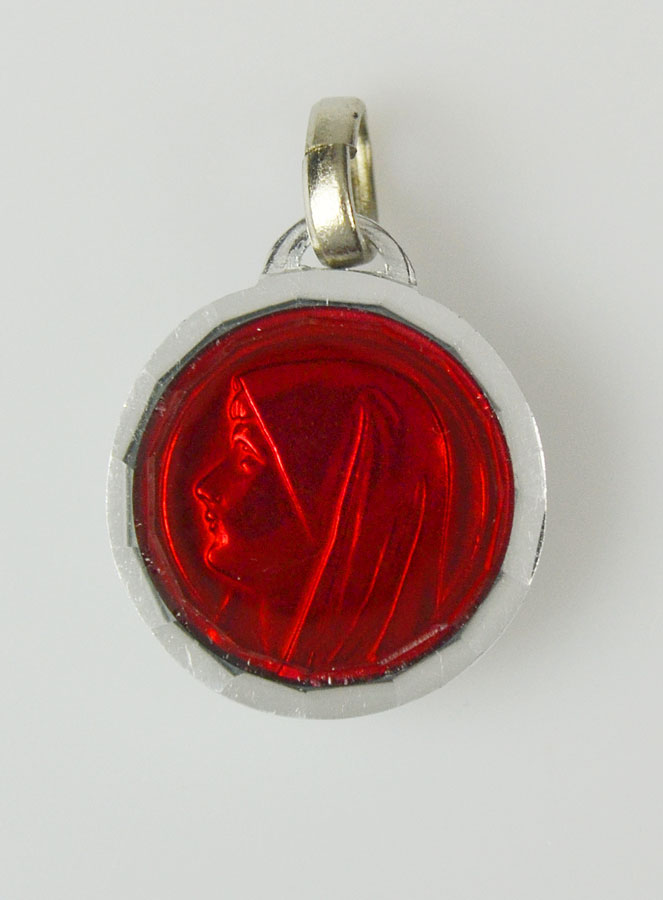 Medalla de la Virgen María Roja y Agua de Lourdes, esta bonita medalla es de metal plateado y mide 18 mm. Contiene una gota de agua de la milagrosa cueva de Lourdes en la parte posterior de la medalla. Una fabricación francesa de Lourdes exclusiva para nuestra tienda.