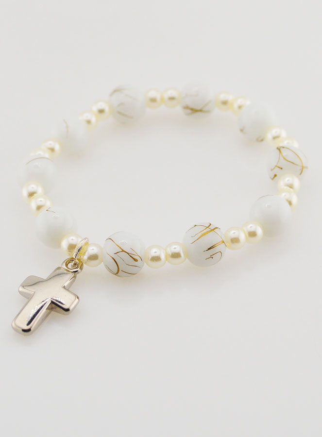 Pulsera Decenario Infantil - Blanca, esta bonita pulsera está hecha de cuentas de plástico montadas sobre elástico extra resistente. Está decorado con una cruz de metal plateado. Dimensiones detalladas: Diámetro 6cm Cuentas de 6 y 3mm Cruz 15 x 10mm